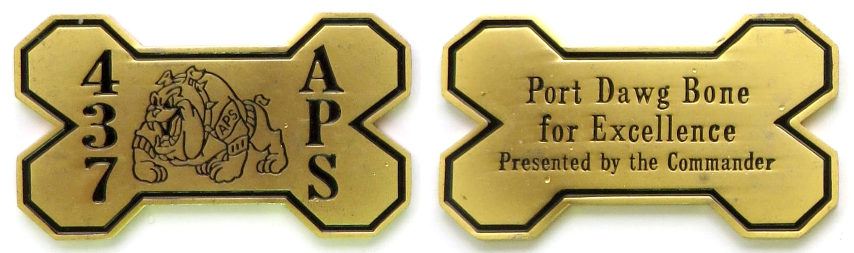 Bone shaped coin, brass in color, 1 1/2 inches high x 3 5/8 inches wide. 437th Aerial Port Squadron, 437th Airlift Wing. Read More