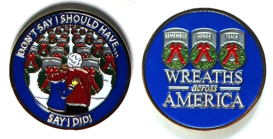 Round shaped coin, brass in color, 1 3/4 inches in diameter. Wreaths Across America. Read More
