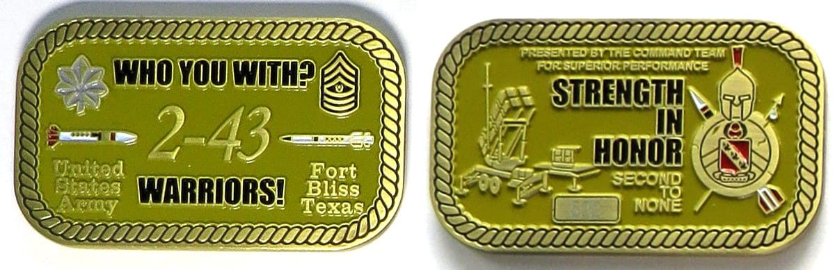 Rectangular shaped coin, brass in color, 1 1/2 inches high x 2 1/2 inches wide; Coin Number 522. 2nd Battalion, 43rd Air Defense Artillery Regiment, 11th Air Defense Artillery Brigade. Read More