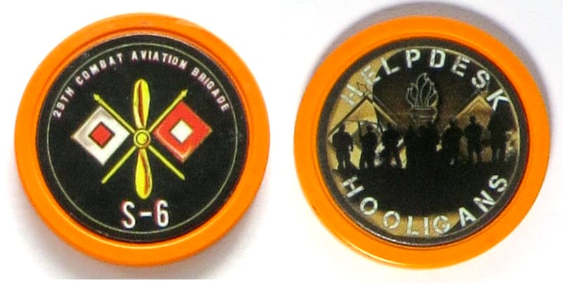 Round shaped poker chip, orange in color, 1 1/2 inches in diameter. S-6, 29th Combat Aviation Brigade, Maryland Army National Guard. Ed Note: S-6 Office in US Army parlance handles the communications aspects of the unit staff. Read More
