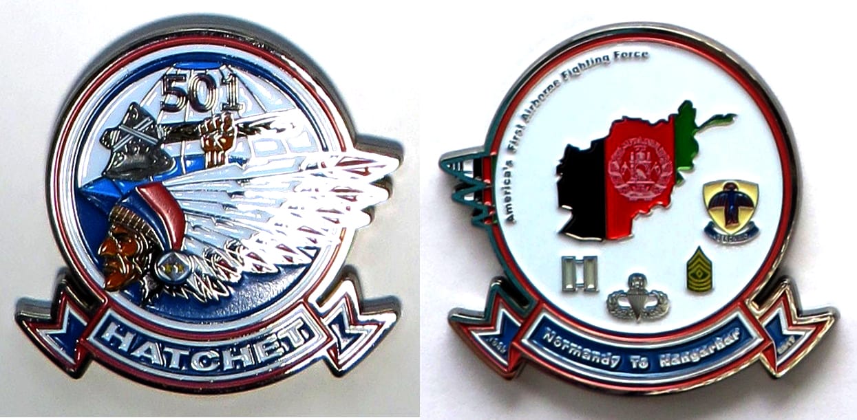 Round shaped coin with ribbon banner below and Indian headdress protruding left, pewter in color, 2 3/8 inches high x 2 1/2 inches wide. 1st Battalion, 501st Infantry Regiment, 25th Infantry Division. Read More
