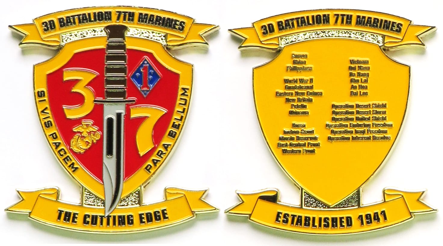 Shield shaped coin with a granite backing and ribbon banners above and below, brass in color, 3 inches high x 2 3/4 inches wide. The 3rd Battalion, 7th Marines was deployed as part of the Special Purpose Marine Air-Ground Task Force - Crisis Respons... Read More