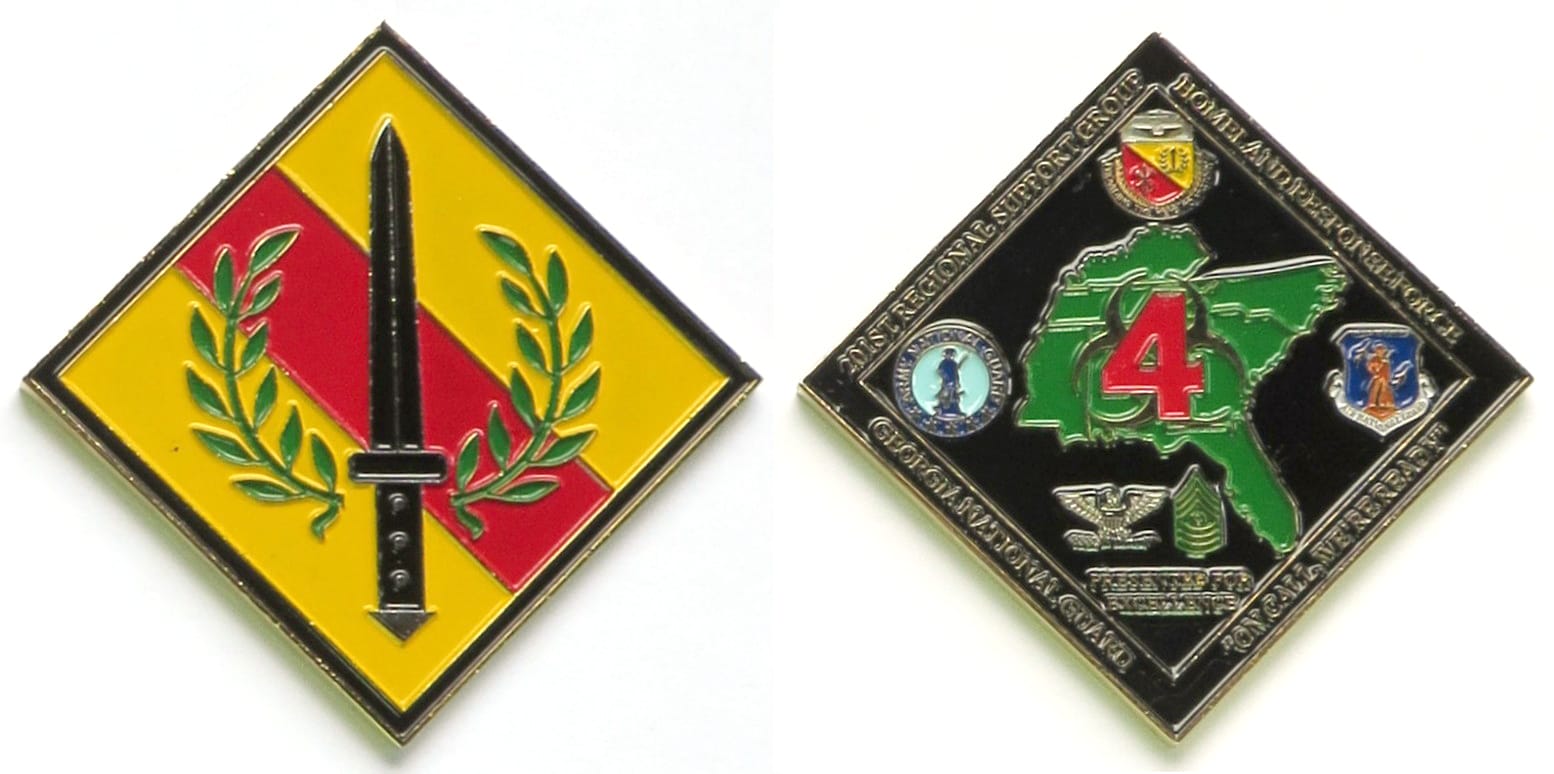 Pewter colored coin, 2 1/2 inches high x 3 1/2 inches wide. SIDE 1: 4th Infantry Division's insignia consisting of four green ivy leaves arranged in a cross superimposed by an eagle in full flight carrying a 4th Infantry Division shoulder patch in... Read More
