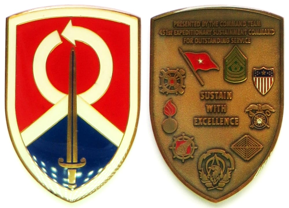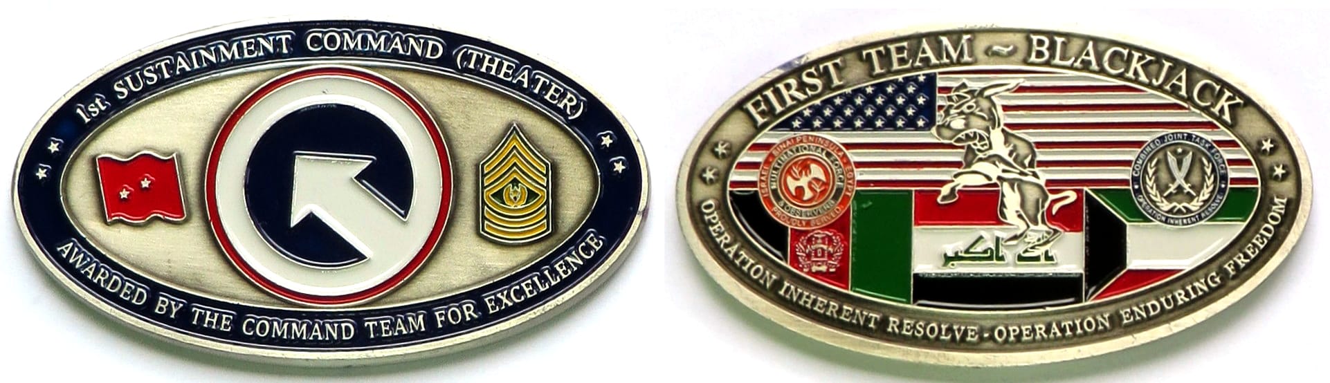 Oval shaped coin, pewter in color, 2 inches high x 3 1/2 inches wide. 1st Sustainment Command. Read More
