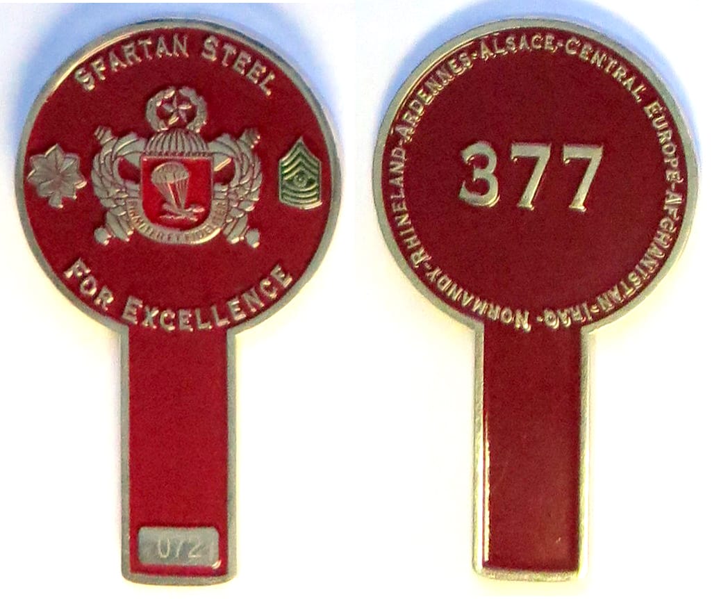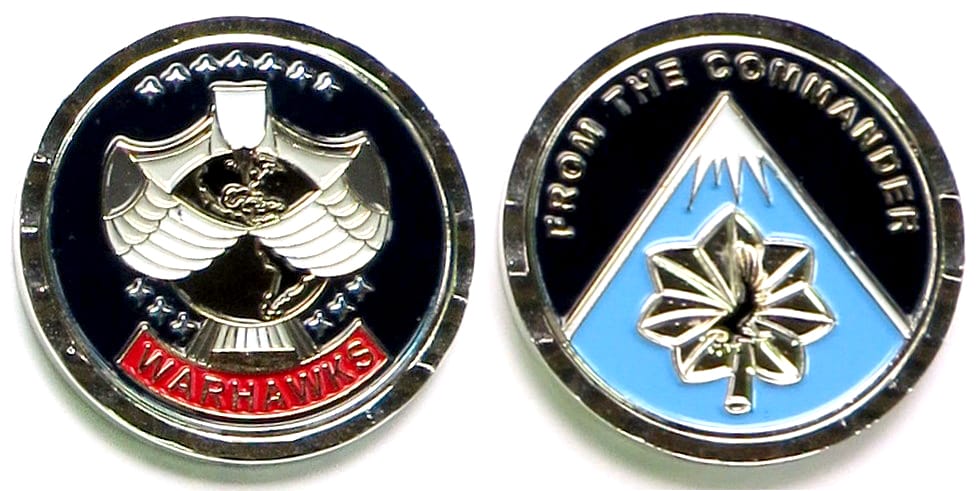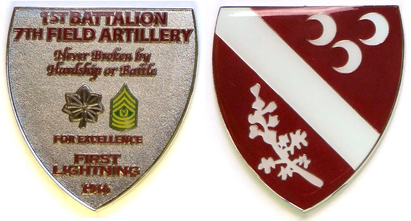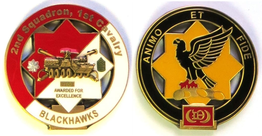 Round shaped coin on a short rectangular base, brass in color, 2 inches high x 2 inches wide. 2nd Squadron, 1st Cavalry Regiment, 4th Infantry Division. Read More