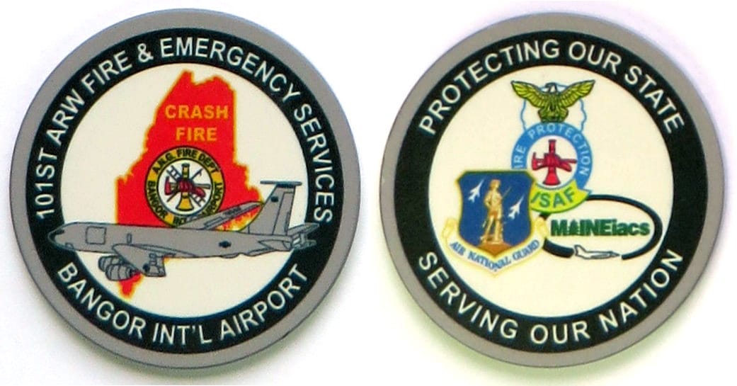 Round shaped poker chip, gray in color, 1 3/4 inches in diameter. Fire & Emergency Service, 101st Air Refueling Wing. Read More