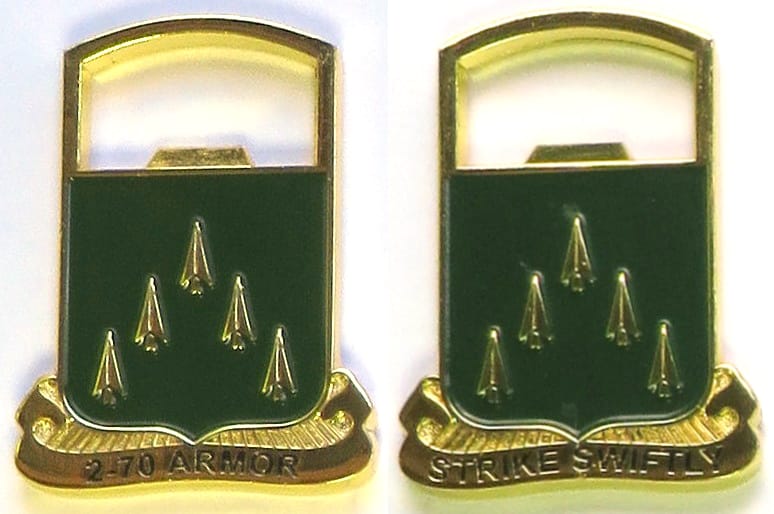 Shield shaped bottle opener with ribbon banner under, brass in color, 2 inches highx 1 1/2 inched wide. 2nd Battalion, 70th Armored Regiment, 1st Infantry Division. Read More