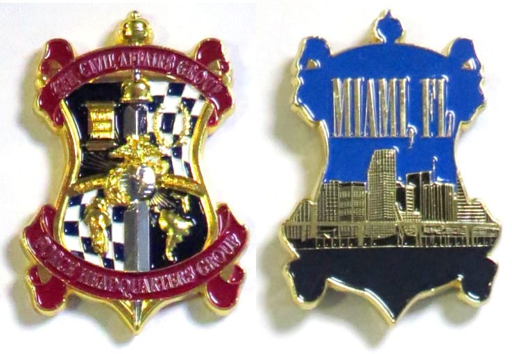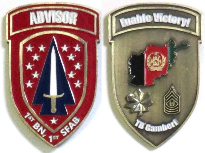 Shield shaped coin with tab banner above, brass in color, 2 1/3 inches high x 1 1/2 inches wide. 1st Battalion, 1st Security Assistance Brigade. Read More