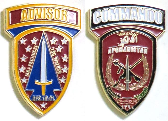 Shield shaped coin with tab banner above, brass in color. 2 1/2 inches high x 1 3/4 inches wide. MAJ Pachucki writes. "This coin was presented by MAJ Mike Pachucki and 1SG Sammy Walker on 17 November 2018. They served at Camp Scorpion, Afghaniatan... Read More