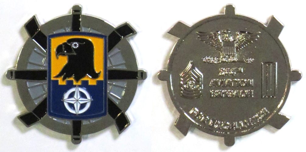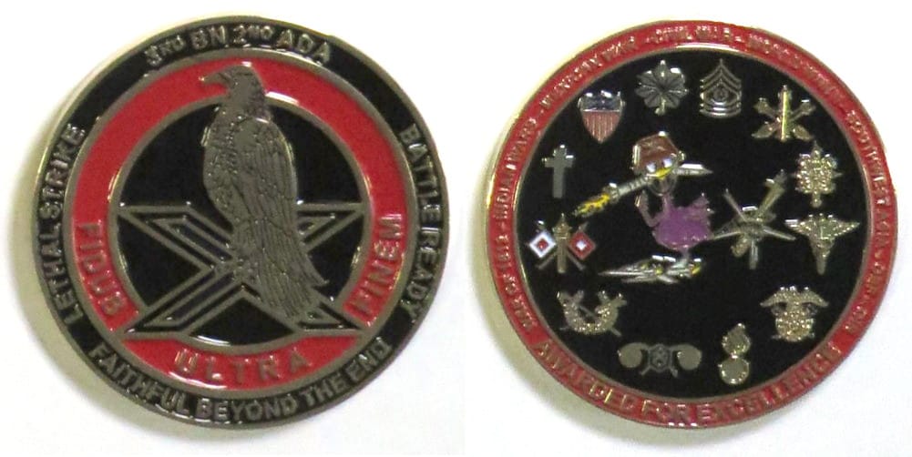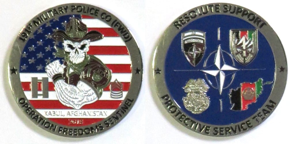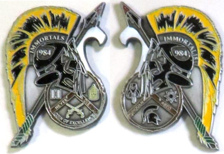 Pewter colored coin, 2 3/8 inches high x 1 1/2 inches wide. 984th Military Police Company, 89th Military Police Brigade. Read More
