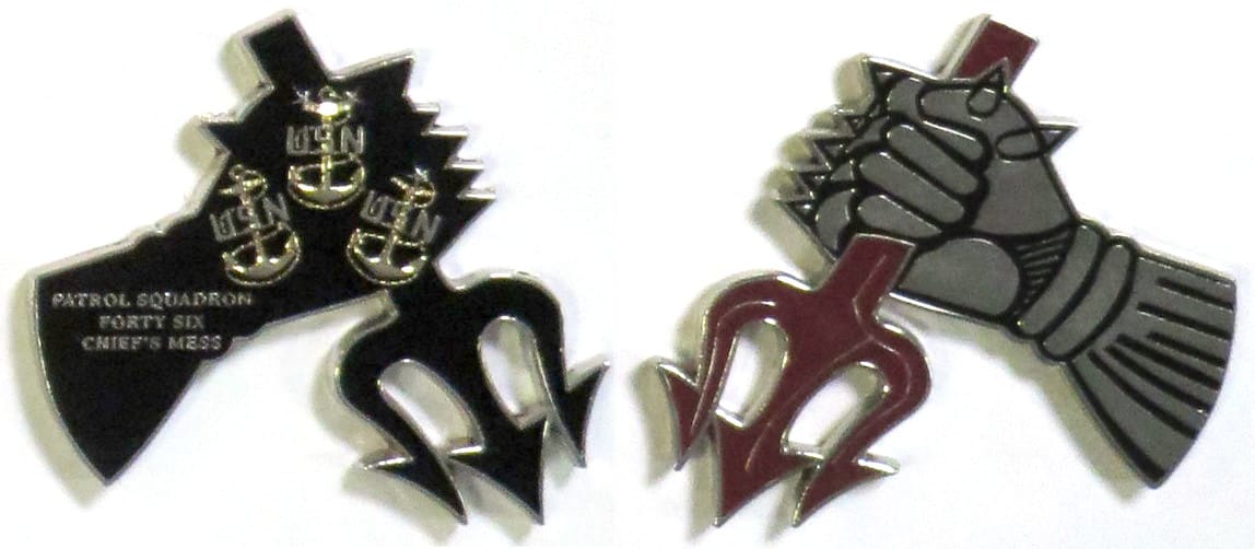 Coin is shaped like a mailed fist grasping a trident, pewter in color, 2 1/8 inches high x 2 1/2 inches wide. Patrol Squadron 46 (VP-46) Read More