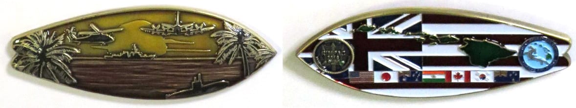 Surfboard shaped coin, brass in color, 1 1/2 inches high x 4 1/4 inches wide. Exercise Rim of the Pacific, 2018 (RIMPAC-2018) Held every two years by Commander, U.S. Pacific Fleet (PACFLT), and executed by Commander, U.S. 3rd Fleet (C3F), RIMPA... Read More