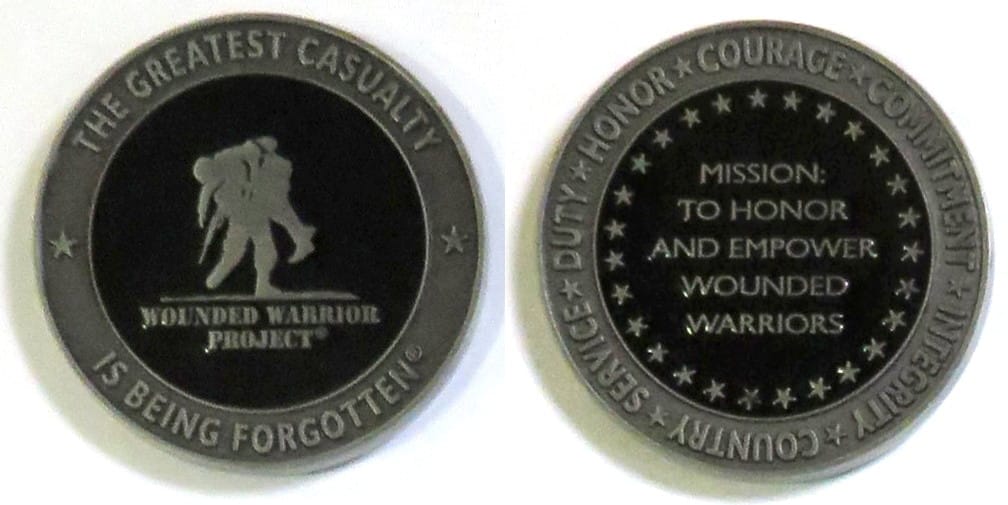 Round shaped coin, pewter in color, 2 inches in diameter. Wounded Warrior Project is a charity and veterans service organization founded in 2003 that offers a variety of programs, services and events for wounded veterans of the military actions fo... Read More