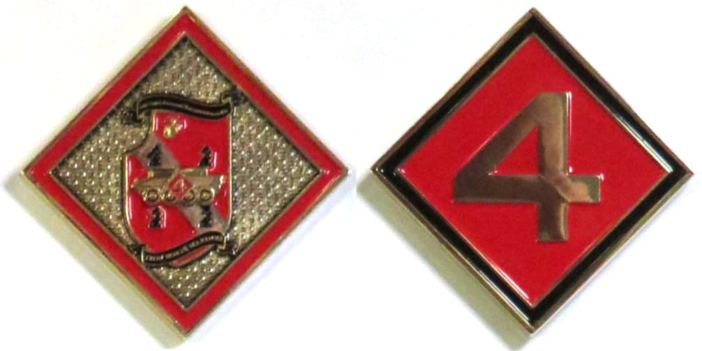 Square shaped coin, angle down, brass in color, 2 inches high x 2 inches wide. 4th Light armored Reconnaissance Battalion. Read More