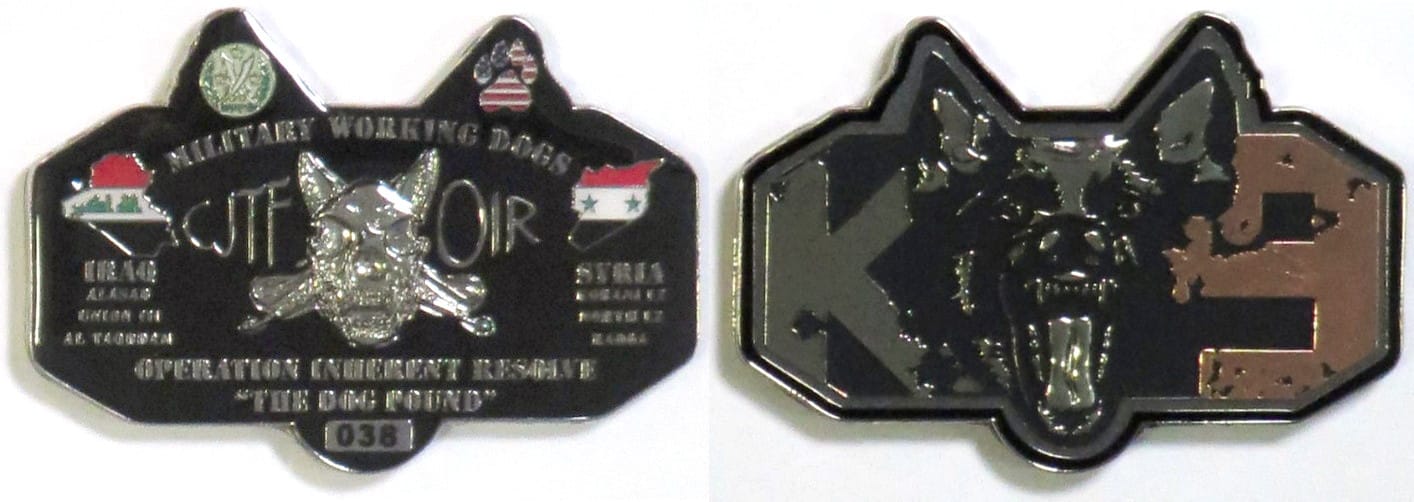Octagon shaped coin with a canine face superimpsed and dog ears and chin protruding, pewter in color, 2 inches high x 3 inches wide; Coin Number 038. Military Working Dogs. This coin pays tribute to military working dogs participating in Combin... Read More