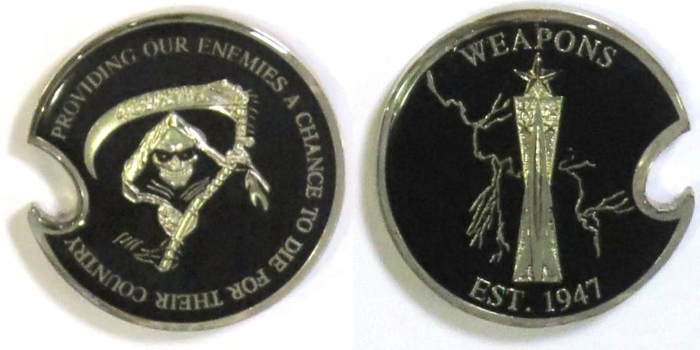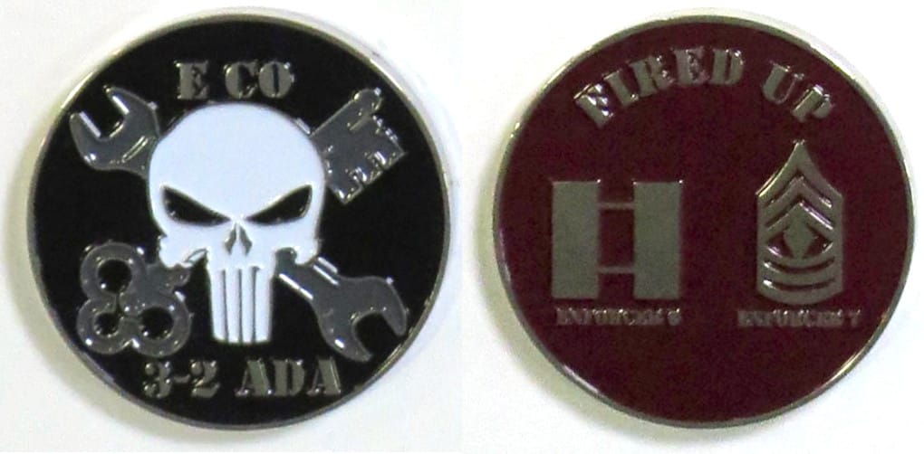 Round shaped coin, pewter in color, 2 inches in diameter. E Company, 3rd Battalion, 2nd Air Defense Artillery Regiment, 31st Air Defense Artillery Brigade. Read More