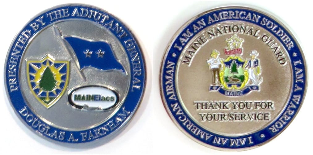 Round shaped coin, pewter in color, 2 inches in diameter. MG Douglas A. Farnham, Maine Adjutant General. Read More