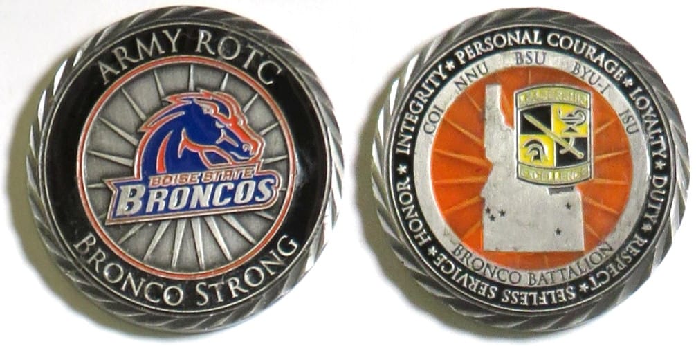 Round shaped coin, pewter in color, 2 inches in diameter. Bronco ROTC Battalion, Boise State University. Read More
