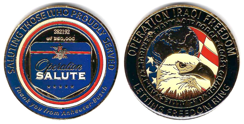 Round shaped coin, brass in color, 2 inches in diameter. Operation Salute. Read More