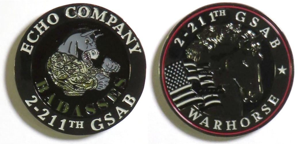 Round shaped coin, pewter in color, 2 inches in diameter. Echo Company, 2nd Battalion, 211th Aviation Regiment, Utah Army National Guard. Read More