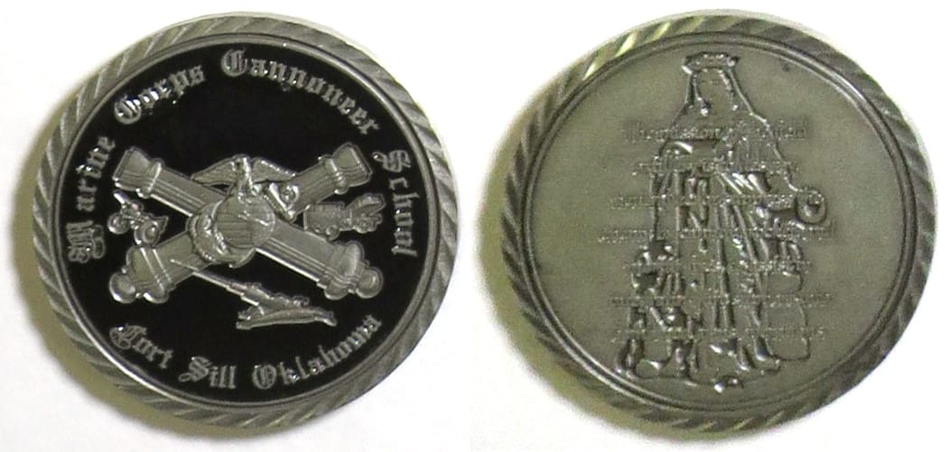 Round shaped coin, pewter in color, 2 inches in diameter. Marine Corps Cannoneer School. Read More