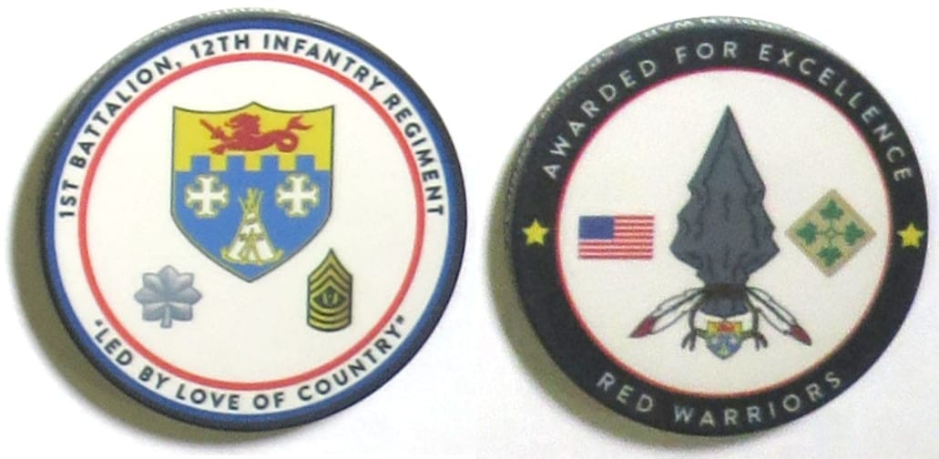 Round shaped poker chip, blue & white in color, 1 7/8 inches in diameter. 1st Battalion, 12th Infantry Regiment, 4th Infantry Division. Read More