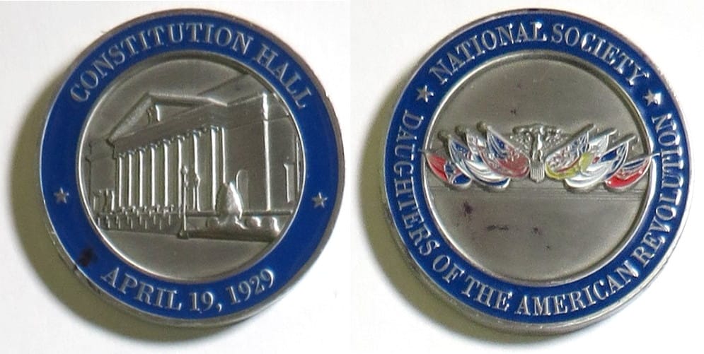 Round shaped coin, pewter in color, 1 3/4 inches in diameter. Constitution Hall, Daughters of the American Revolution. The Daughters of the American Revolution is a lineage-based membership service organization for women who are directly descen... Read More