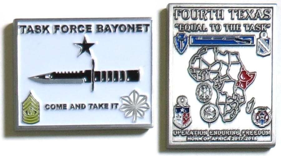 Rectangular shaped coin, pewter in color, 1 3/8 inches high x 1 3/4 inches wide. Task Force Bayonet. Texas Army National Guard. Read More