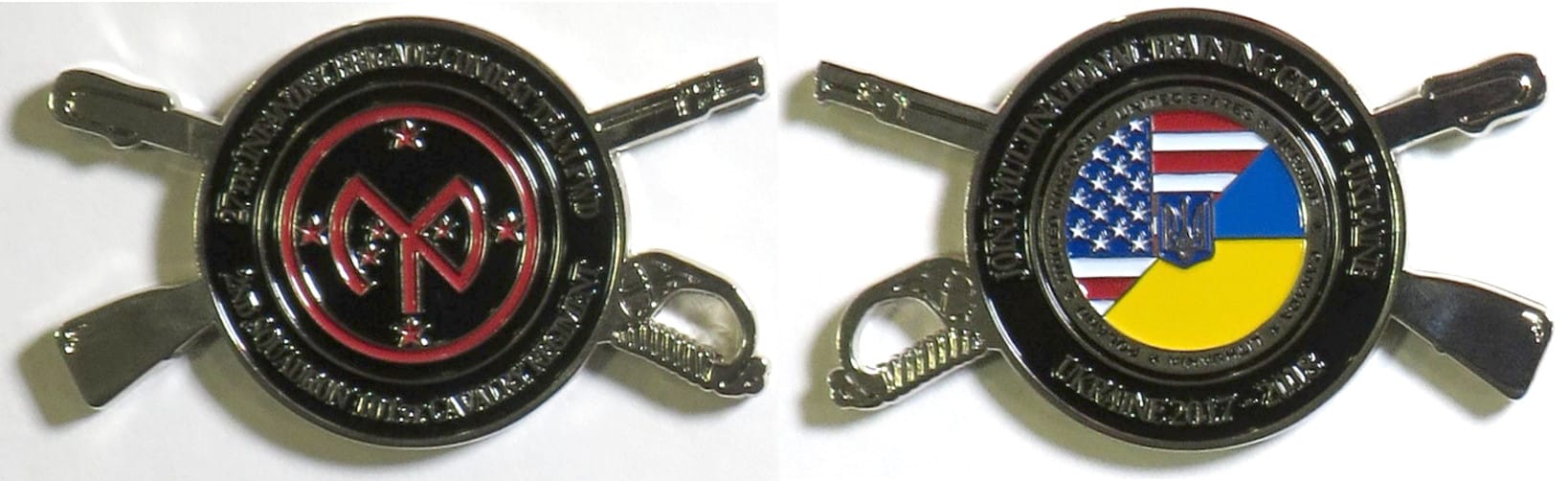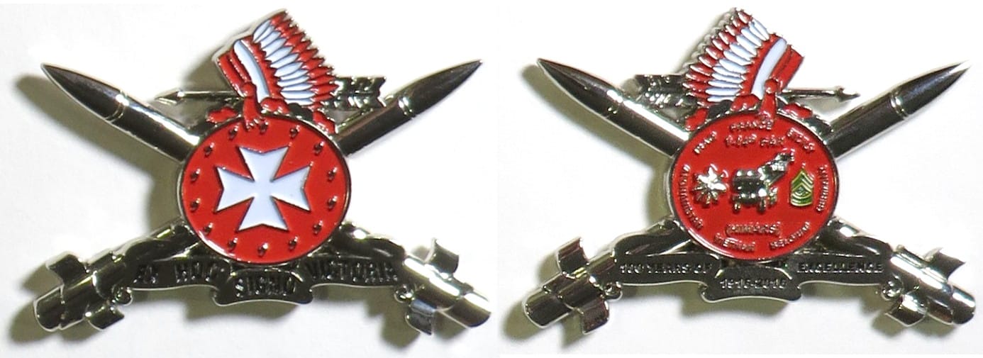 Round shaped coin backed by a crossed saber and rifle, pewter in color, 1 3/4 inches high x 2 3/4 inches wide. 2nd Squadron, 101st Cavalry Regiment, New York Army National Guard. Coin was designed by 1LT Derrick Garner Read More