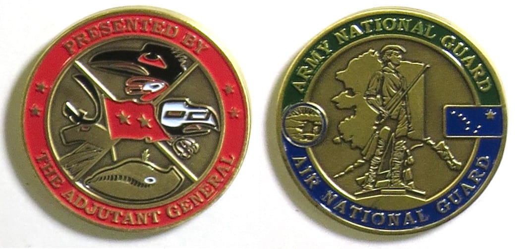 Round shaped coin, brass in color, 1 3/4 inches in diameter. Alaska National Guard. Read More
