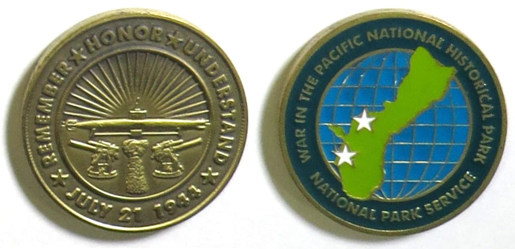 Round shaped coin, brass in color, 1 3/4 inches in diameter. War in the Pacific National Historical Park, National Park Service. Read More