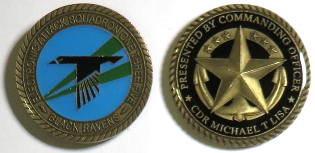 Round shaped coin, old brass in color, 1 3/4 inches in diameter. CDR Michael T. Lisa, Electronic Attack Squadron 135. Read More