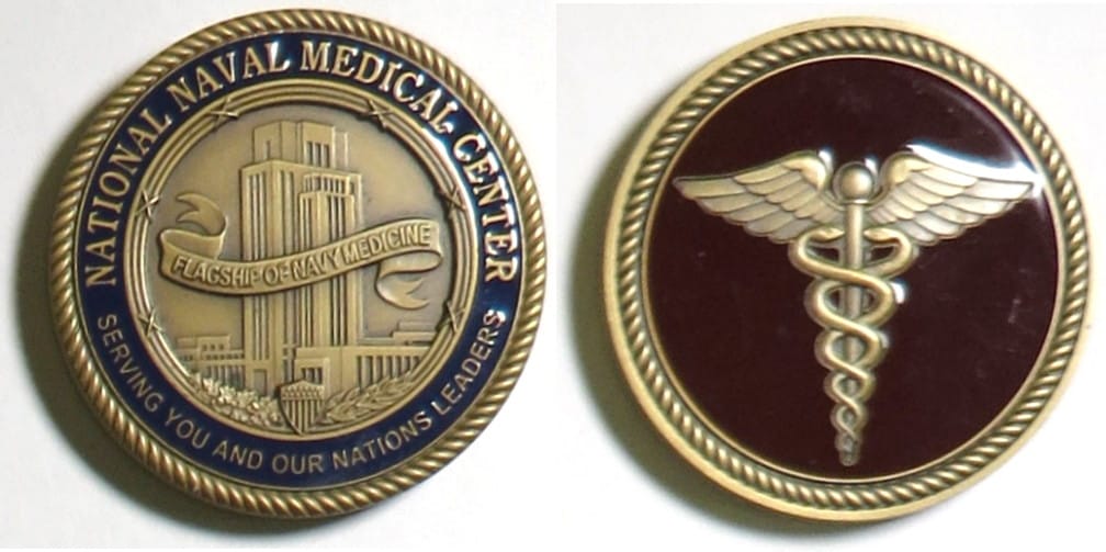 Round shaped coin, brass in color, 1 3/4 inches in diameter. The Walter Reed National Military Medical Center, formerly known as the National Naval Medical Center and colloquially referred to as the Bethesda Naval Hospital, Walter Reed, or Navy Me... Read More
