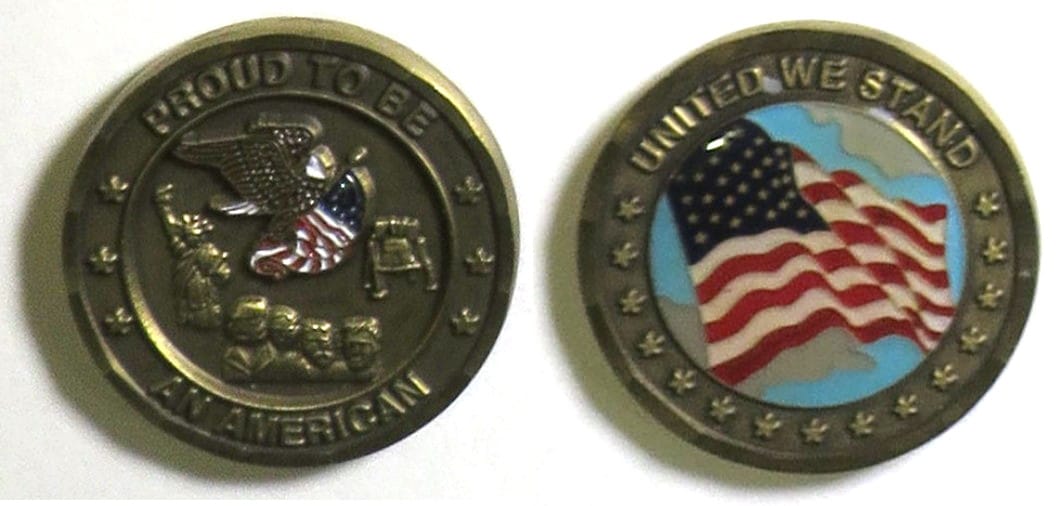 Round shaped coin, pewter in color, 1 5/8 inches in diameter. Read More