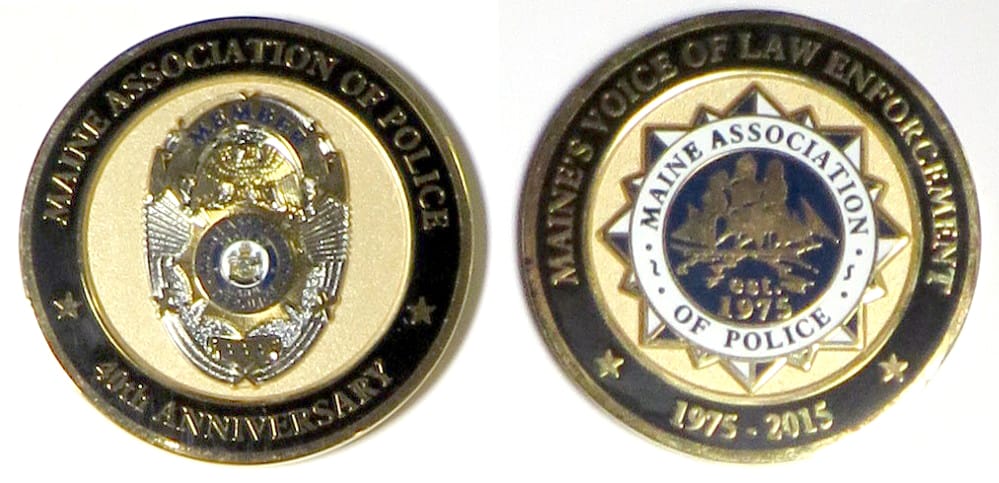 Round shaped coin, brass in color, 1 3/4 inches in diameter. The Maine Association of Police (MAP) was established in 1975 by a small group of local police associations. These associations voluntarily banded together to promote and deĀvelop a frie... Read More