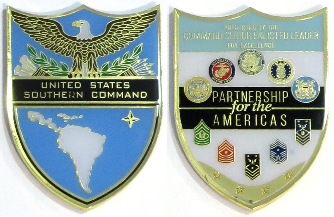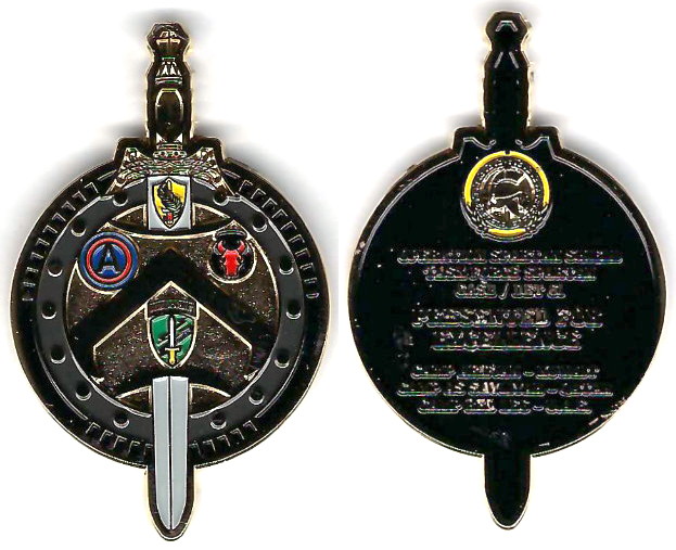 Round shaped coin pierced by a sword, point down, brass in color, 2 1/2 inches high x1 1/2 inches wide. CSAD-A Detachment 61, 363rd Civil Affairs Command. Read More