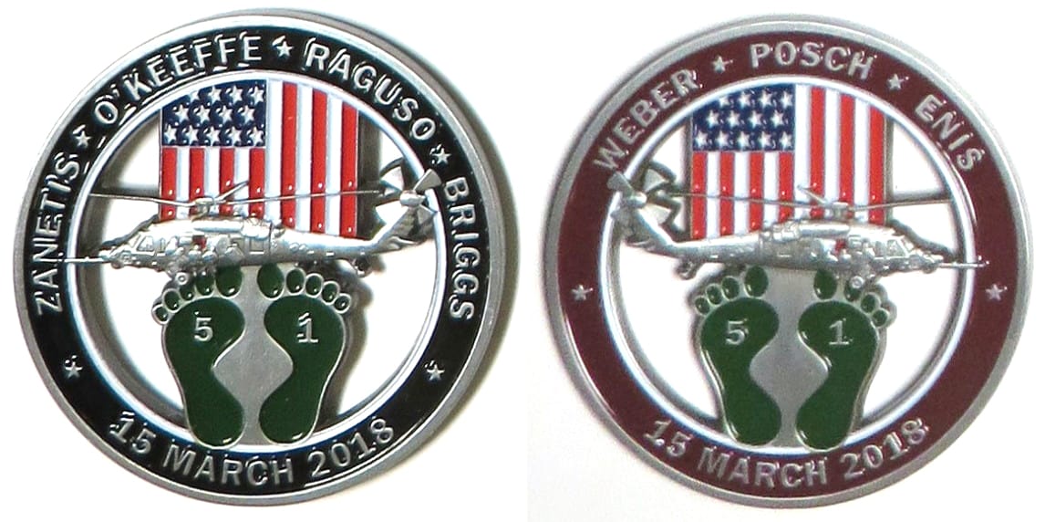 Round shaped coin, pewter in color, 2 inches in diameter. 106th Rescue Wing, 38th Rescue Squadron. Seven Airmen died on 15 March 2018 when an HH-60 Pave Hawk helicopter crashed in western Iraq. The Airmen were participating in Operation Inheren... Read More