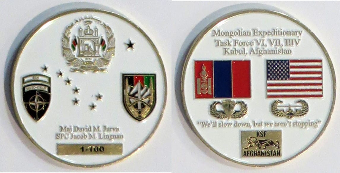 Round shaped coin, brass in color, 2 inches in diameter. Mongolian Expeditionary Task Force, Afghanistan. Read More