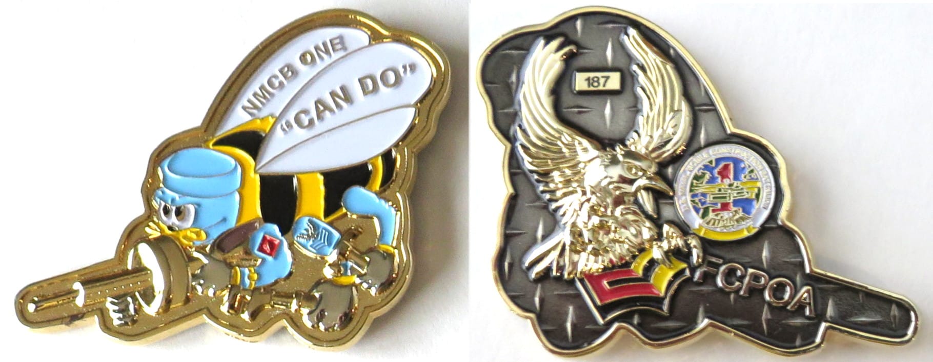 Brass colored coin, 2 inches high x 2 1/4 inches wide; Coin Number 187. Naval Mobile Construction Battalion 1. Read More