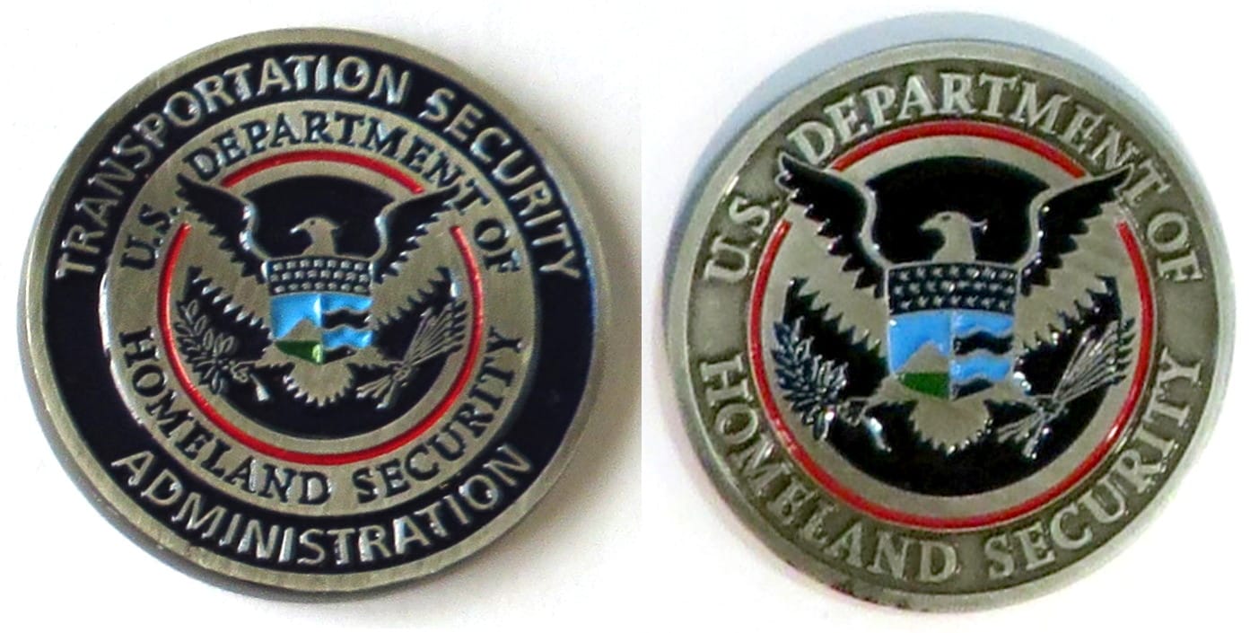 Round shaped coin pewter in color, 1 3/4 inches in diameter. Transportation Security Administration. Read More