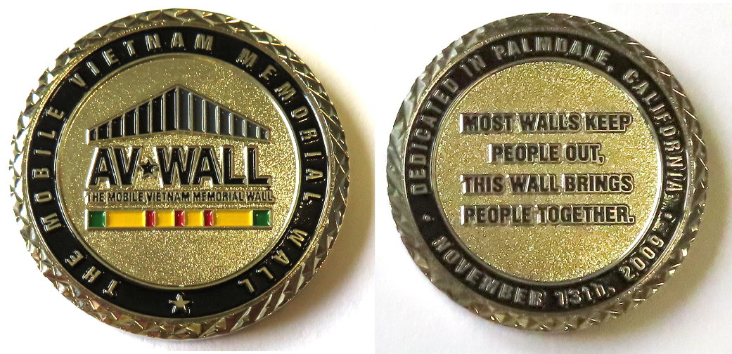 Round shaped coin, pewter in color, 1 3/4 inches in diameter. The Mobile Vietnam Veterans Memorial Wall. On Veterans Day 1996, the Vietnam Veterans Memorial Fund (VVMF) unveiled a half-scale replica of the Vietnam Veterans Memorial in Washingto... Read More