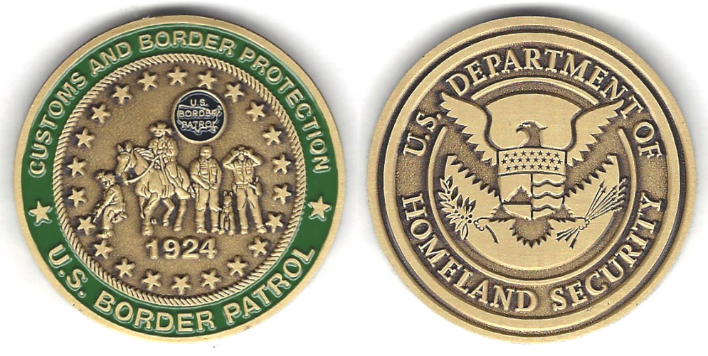Round shaped coin, brass in color, 1 3/4 inches in diameter. U.S. Border Patrol, U.S. Department of Homeland Protection. The United States Border Patrol (USBP) is the United States Customs and Border Protection's federal law enforcement arm wit... Read More
