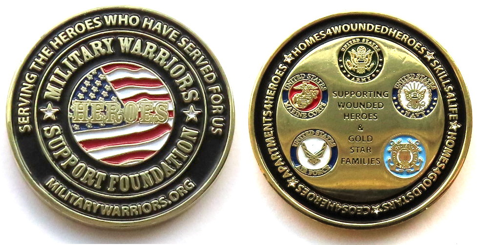 Round shaped coin, brass in color, 1 1/2 inches in diameter. Military Warriors Support Foundation. "Military Warriors Support Foundation is a 501(c)(3) non-profit charity, founded by LTG. Leroy Sisco (Ret), in 2007. Our mission is to provide su... Read More