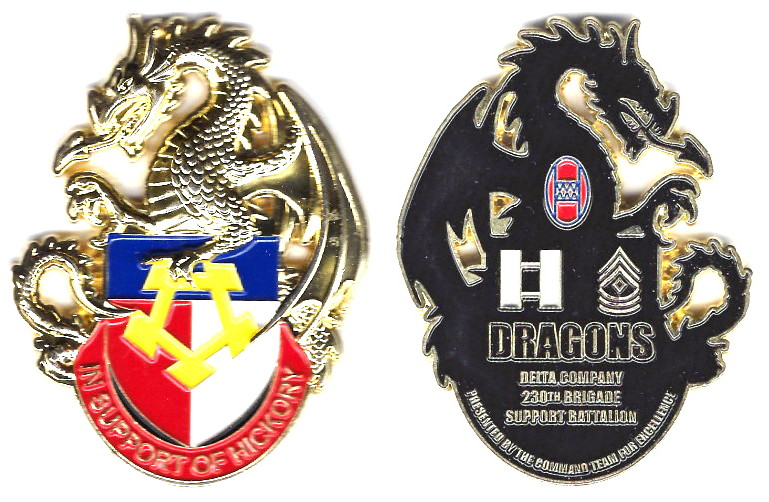 Brass colored coin, 3 inches high x 2 1/4 inches wide. Delta Company, 230th Brigade Support Battalion, 30th Heavy Brigade Combat Team. The 230th Brigade Support Battalion is a support unit of the 30th Heavy Brigade Combat Team, North Carolina A... Read More