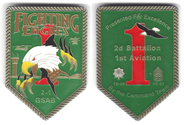 Shield shaped coin,antique brass in color, 2 1/2 inches high x 1 3/4 inches wide. 2nd Battalion (General Support), Combat Aviation Brigade, 1st Infantry Division From a US Army News Release by SGT Patrick Jubrey, dated 20 March 2019: GRAFENW... Read More