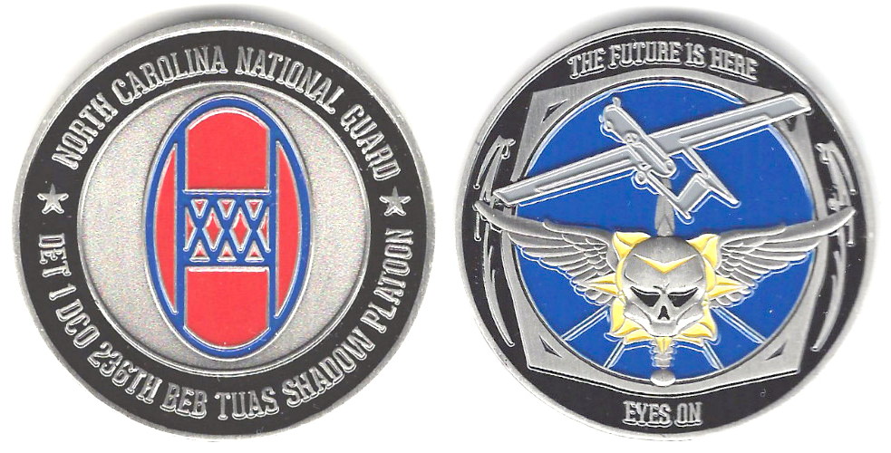Round shaped coin, pewter in color, 2 inches in diameter. Detachment 1, D Company, 236th Brigade Engineer Battalion, North Carolina Army National Guard. Side 1 of the coin features the "Class A" (colorized) version of the 30th Brigade Combat Te... Read More