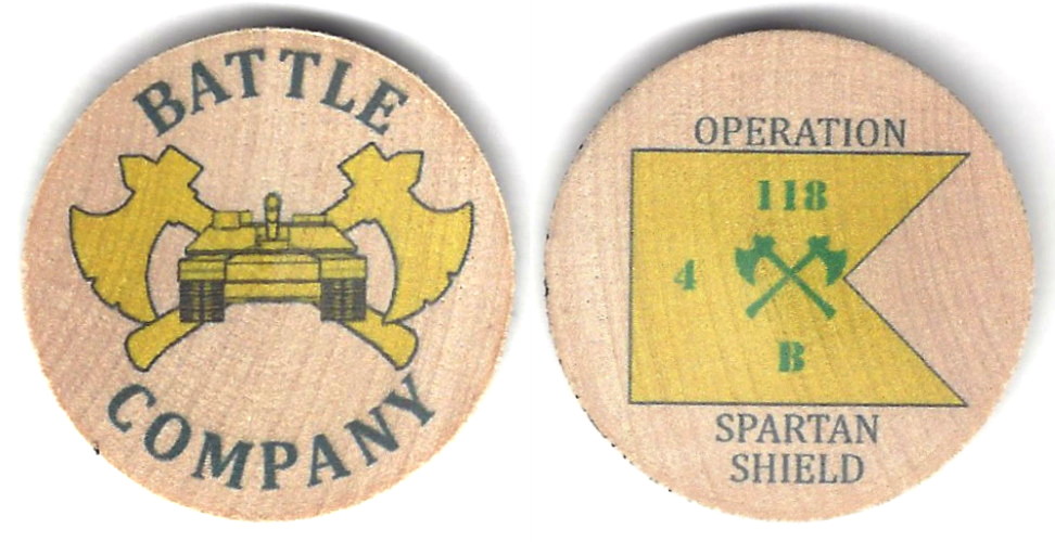 Round shaped wooden coin, natural wood in color, 1 1/2 inches in diameter. Battle Company, 4th Battalion, 118th Armored Regiment, North Carolina Army National Guard. From 30th Armored Brigade Combat team Facebook Page: U.S. Soldiers in the 30t... Read More