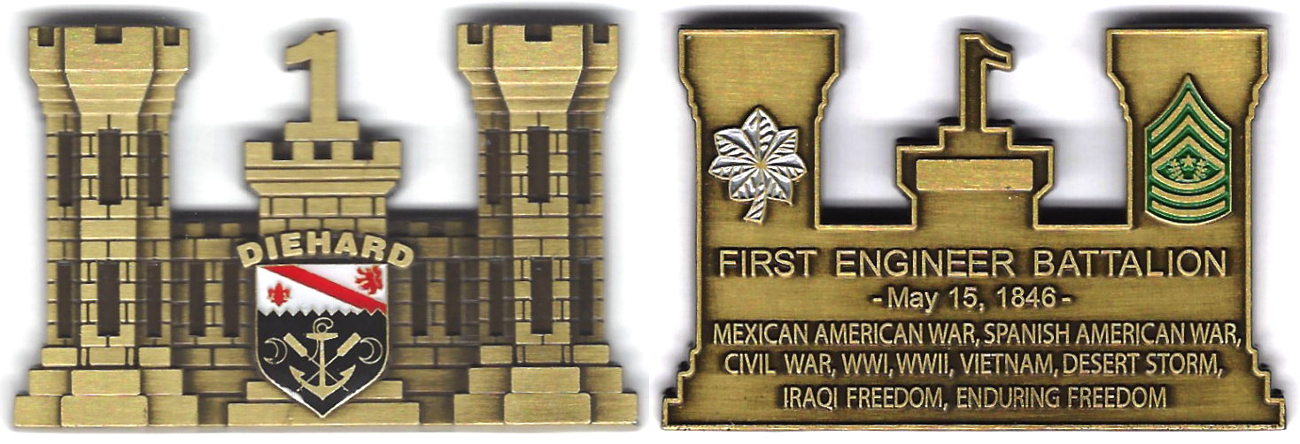 Engineer castle shaped bottle opener, brass in color, 1 5/8 inches high x 2 1/2 inches wide. 1st Engineer Battalion, 1st Infantry Division. The 1st Engineer Battalion is a unit of the United States Army with a record of accomplishment in both p... Read More