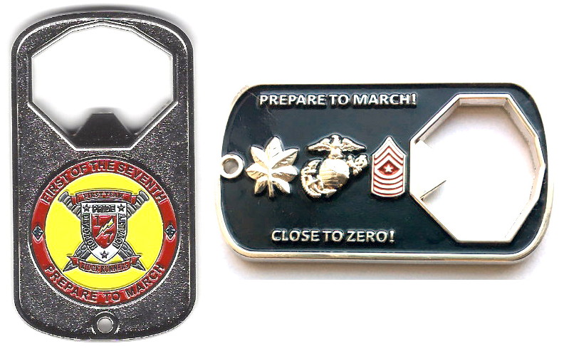 Rectangular shaped bottle opener with narrow sides rounded, pewter in color, 2 1/2 inches high x 1 3/8 inches wide. 1st Battalion, 7th Marines, 1st Marine Division. The 1st Battalion, 7th Marines (1/7) is an infantry battalion of the United Sta... Read More