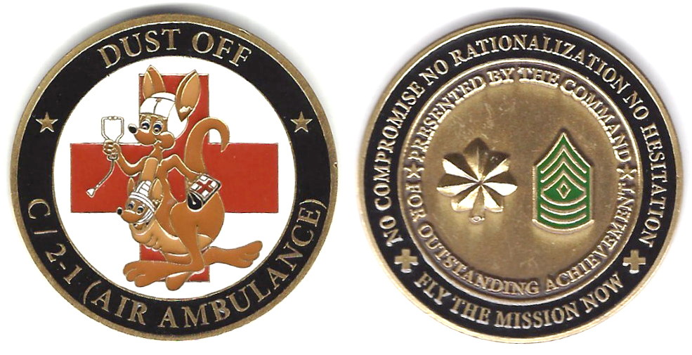 Round shaped coin, brass in color, 1 3/4 inches in diameter. C Company, 2nd Battalion, 1st Aviation Regiment (Air Ambulance). From a recent post on the 1st Combat Avaition Brigade Facebook page: "After a nine month #AtlanticResolve rotation,... Read More